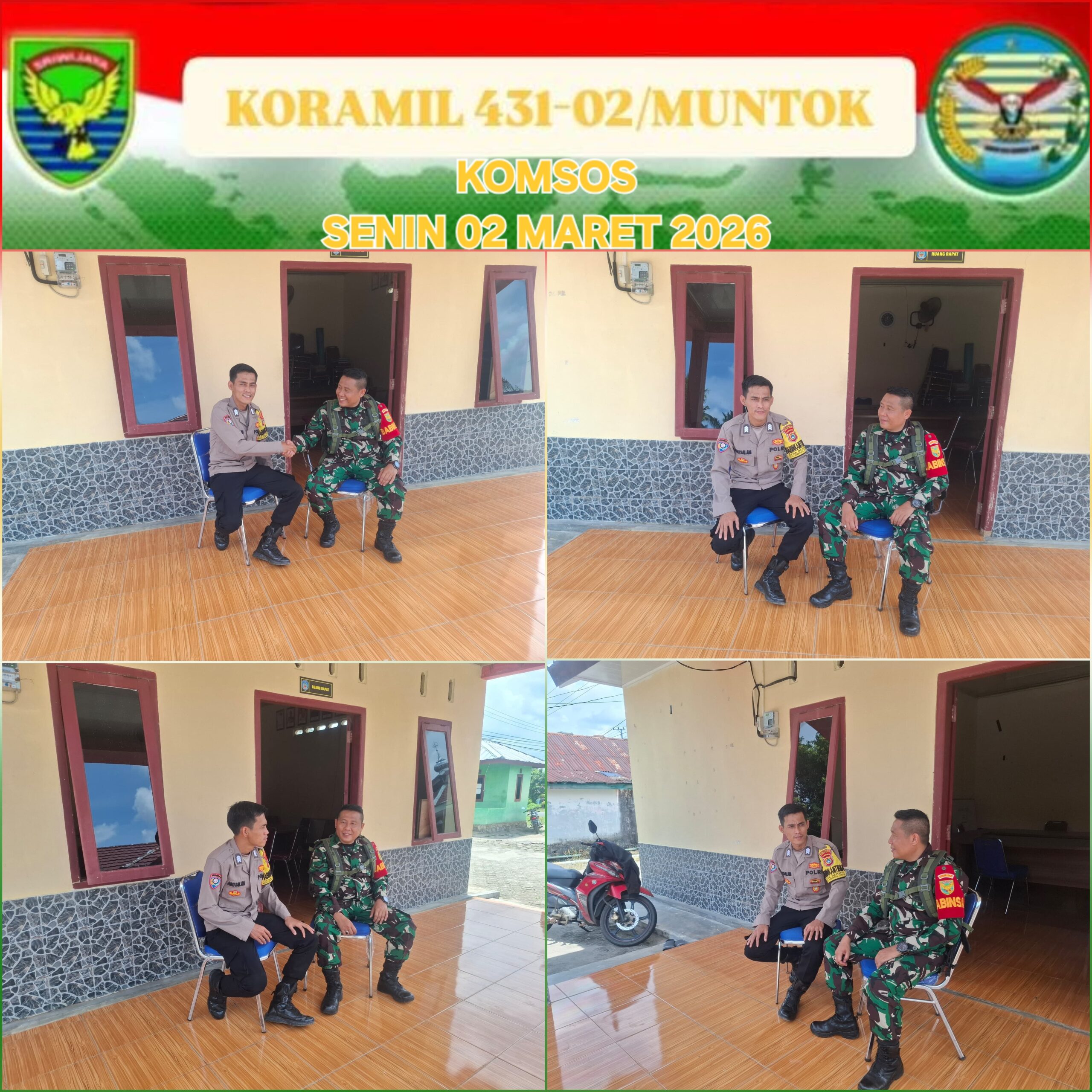 Bangka Barat – Babinsa Koramil 431-02/Mentok, Serda Hendra Gunawan melaksanakan kegiatan Komunikasi Sosial (Komsos) dengan Bripka Abu Salam selaku Bhabinkamtibmas Desa Berang, Kecamatan Simpang Teritip, Kabupaten Bangka Barat, Senin (02/03/2026).